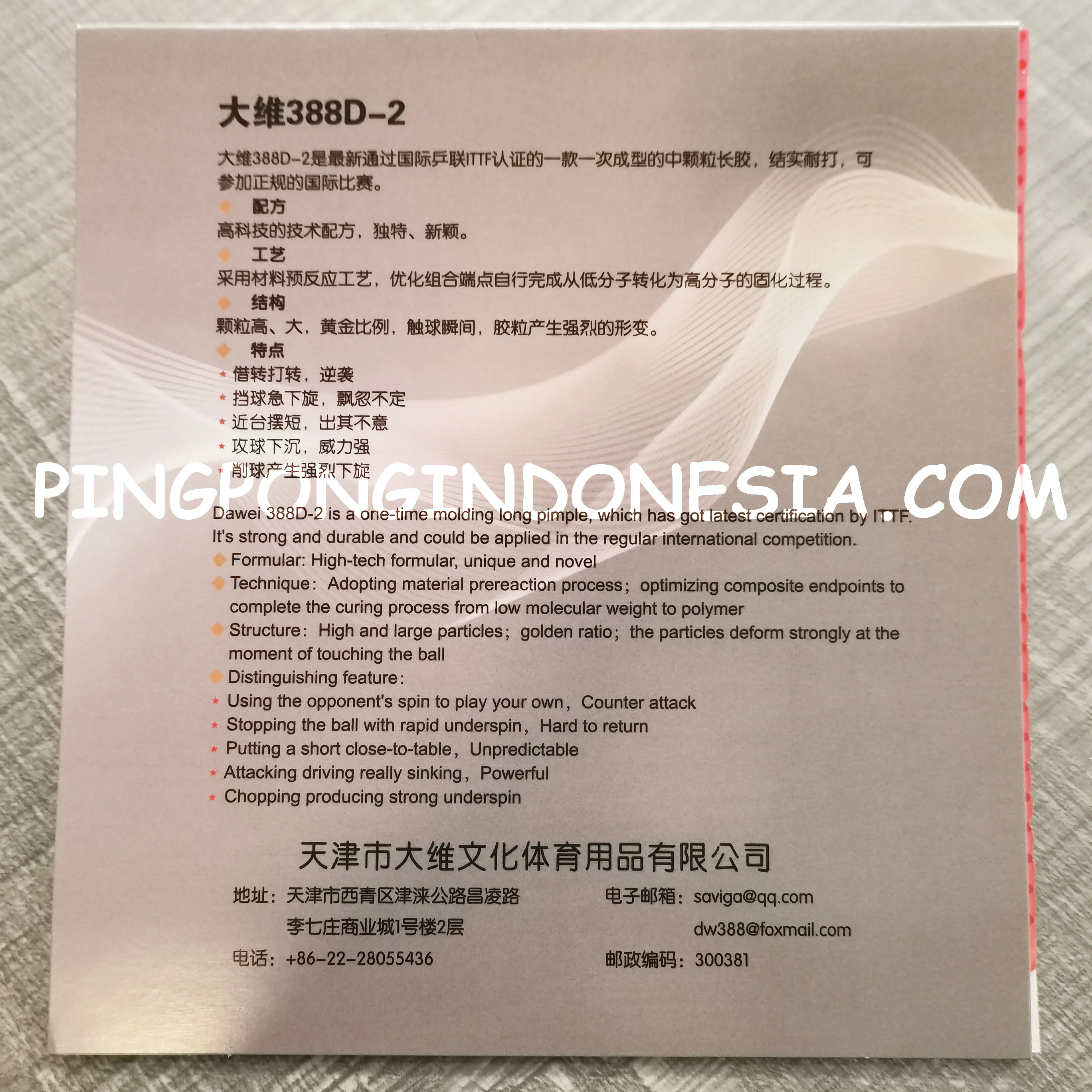 Dawei 388D-2 is a newly designed and ITTF approved long pimple rubber. Its medium diameter pimple size, new material and new manufacturing process are designed for the new balls.