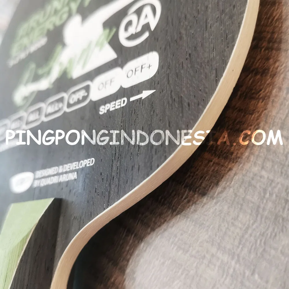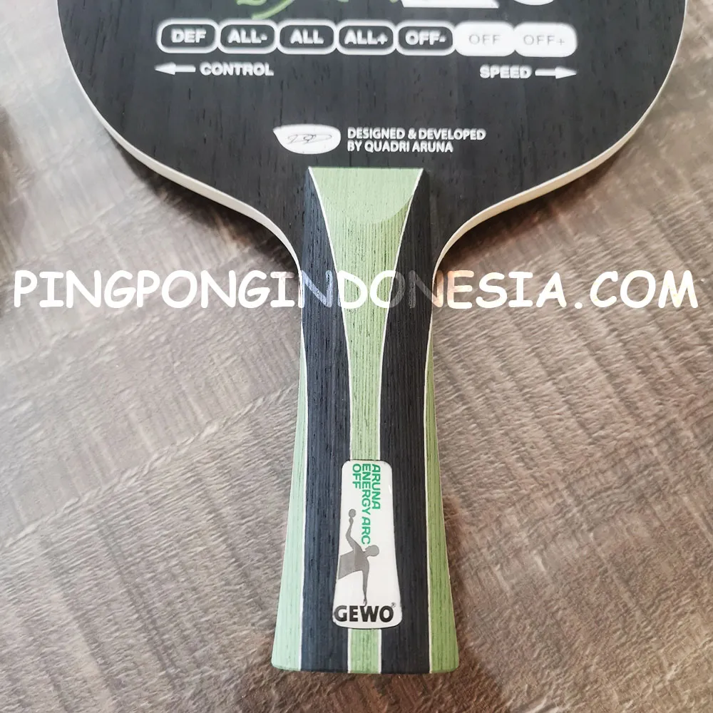 GEWO Aruna Energy ARC OFF combines 5 wooden and 2 aramide carbon fiber plies such that a balanced combination of speed, hardness and control for passive and spin-rich strokes is obtained. If you are looking for the perfect balance of speed and control for powerful attacking without any compromises as regards spin, you may want to take a shot at GEWO Aruna Energy ARC.