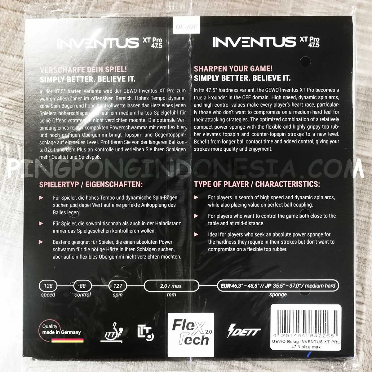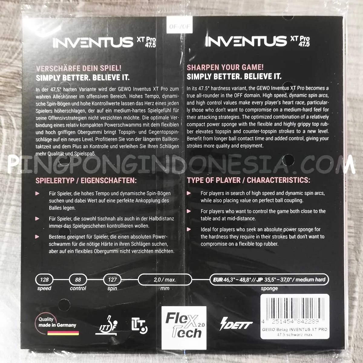 In its 47.5° hardness variant, the GEWO Inventus XT Pro becomes a true all-rounder in the OFF domain. High speed, dynamic spin arcs, and high control values make every player’s heart race, particularly those who don’t want to compromise on a medium-hard feel for their attacking strategies. The optimized combination of a relatively compact power sponge with the flexible and highly grippy top rubber elevates topspin and counter-topspin strokes to a new level. Benefit from longer ball contact time and added control, giving your strokes more quality and enjoyment.