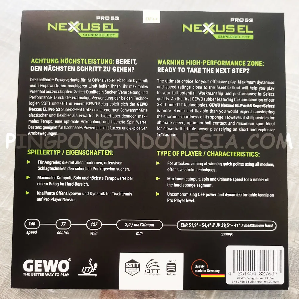 The ultimate choice for your offensive play. Maximum dynamics and speed ratings close to the feasible limit will help you play to your full potential. Workmanship and performance in Select quality. As the first GEWO rubber featuring the combination of our SSTT and OTT technologies, GEWO Nexxus EL Pro 53 SuperSelect is more elastic and flexible than you would expect considering the enormous hardness of its sponge. However, it still provides for ultimate speed, optimum ball contact and maximum spin. Ideal for close-to-the-table power play relying on short and explosive arm action.